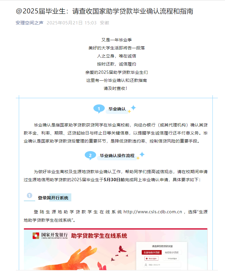 国家助学贷款毕业确认“云”指导:学院官方微信公众号推出专题推文,以图文并茂、步骤清晰的方式,全方位解读国家助学贷款毕业确认流程、关键时间节点、所需材料及常见问题解决方案。此举利用新媒体平台优势,实现精准、高效的政策送达,有效提升了贷款毕业生的操作规范性和责任意识。