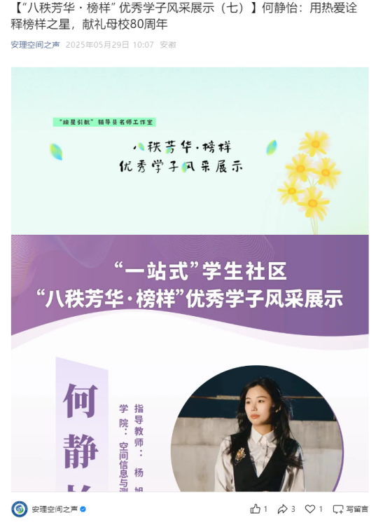 “八秩芳华,榜样力量”熠熠生辉:值此学校八十华诞之际,隆重推出“八秩芳华,榜样力量”优秀学子风采展示系列活动。通过学院公众号深度报道,立体化展现了在自强不息(含优秀受助代表)、志愿服务、学术科研等领域涌现出的先进典型。这些身边榜样的事迹,特别是在诚信、奋斗、感恩方面的闪光点,为全院学生树立了学习标杆,极大激发了见贤思齐、奋发进取的内生动力。
