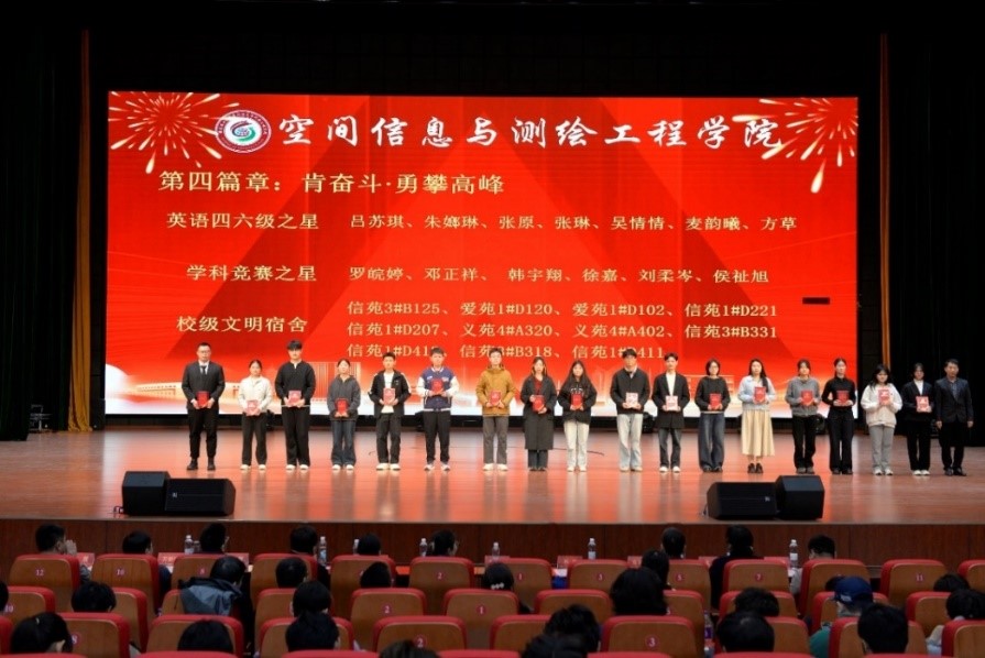 先进班级代表地理空间信息工程2023级1班汪叶漫同学、三好学生标兵代表导航工程2024级1班念志祥同学、国家奖学金代表地理空间信息工程2023级1班檀雨蜜同学、学科竞赛之星代表导航工程22级2班的邓正祥同学、体育先进个人代表遥感科学与技术2023级2班殷鹤然同学等同学分别在会上作了交流发言。
